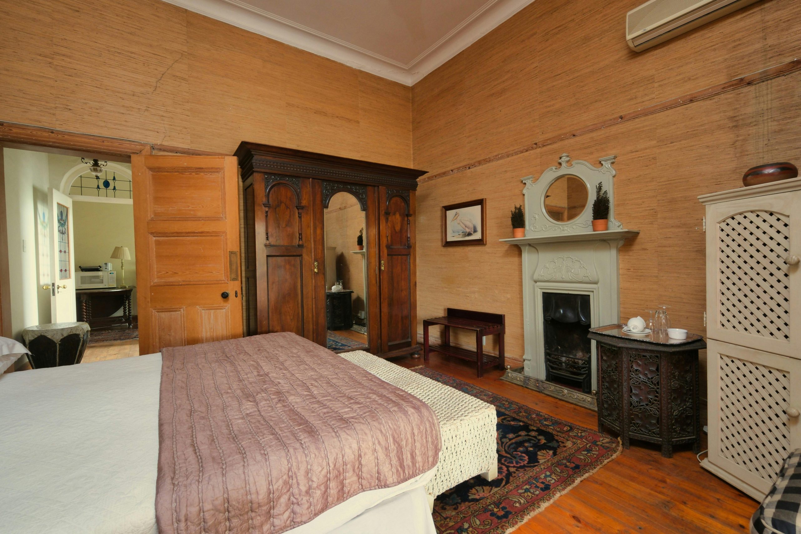 ✅ **Authentic Victorian Period Features**: Restored original high ceilings, solid pine wood flooring, decorative carved Victorian fireplace (note: decorative only, not for active use), stained-glass internal doors, and antique solid wood wardrobe with mirrored doors.